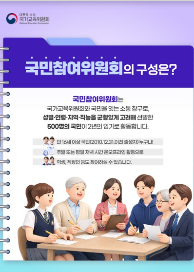 국민참여위원회는 국가교육위원회와 함께 운영되는 공식 참여 창구입니다.